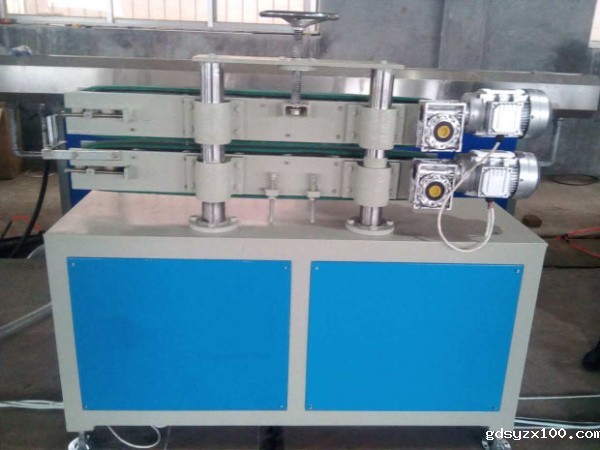 该装置采用轨道式皮带输送。镶入采用了不变向连续输送的方式,有PLC控制输送速度,保证了不同线速度时滴头间距的设定,滴头连续通过机头体时得到充分预热,使滴头与管壁粘结牢固。